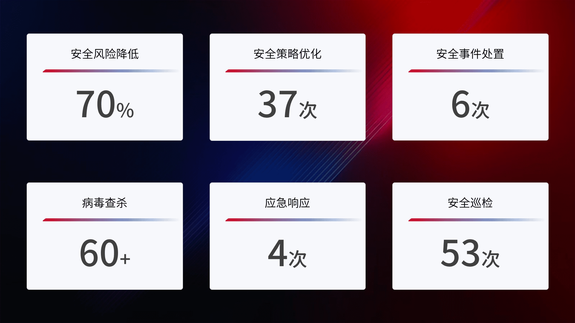 提供全面的安全事件报告体系,,,包括处置报告、、、、周报、、、季度和年度总结,,,,结合持续监控,,,帮助客户深入了解网络安全状况。。。。